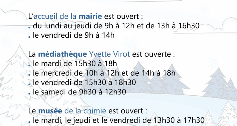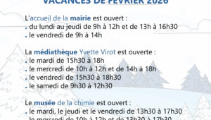 Pendant les vacances de février, du 06 février soir au 23 février matin pour notre zone, les horaires d’accueil de la mairie sont modifiés. En revanche, la médiathèque et le musée sont ouverts normalement.