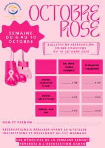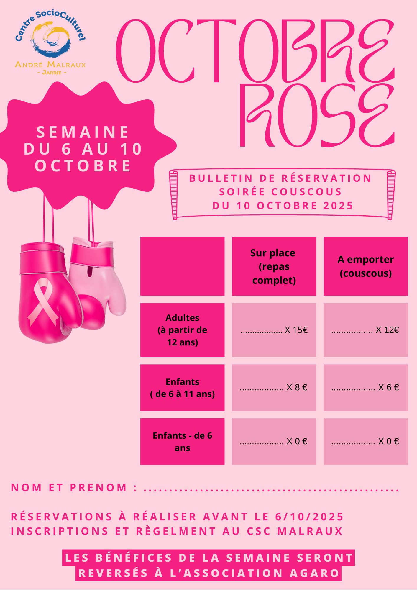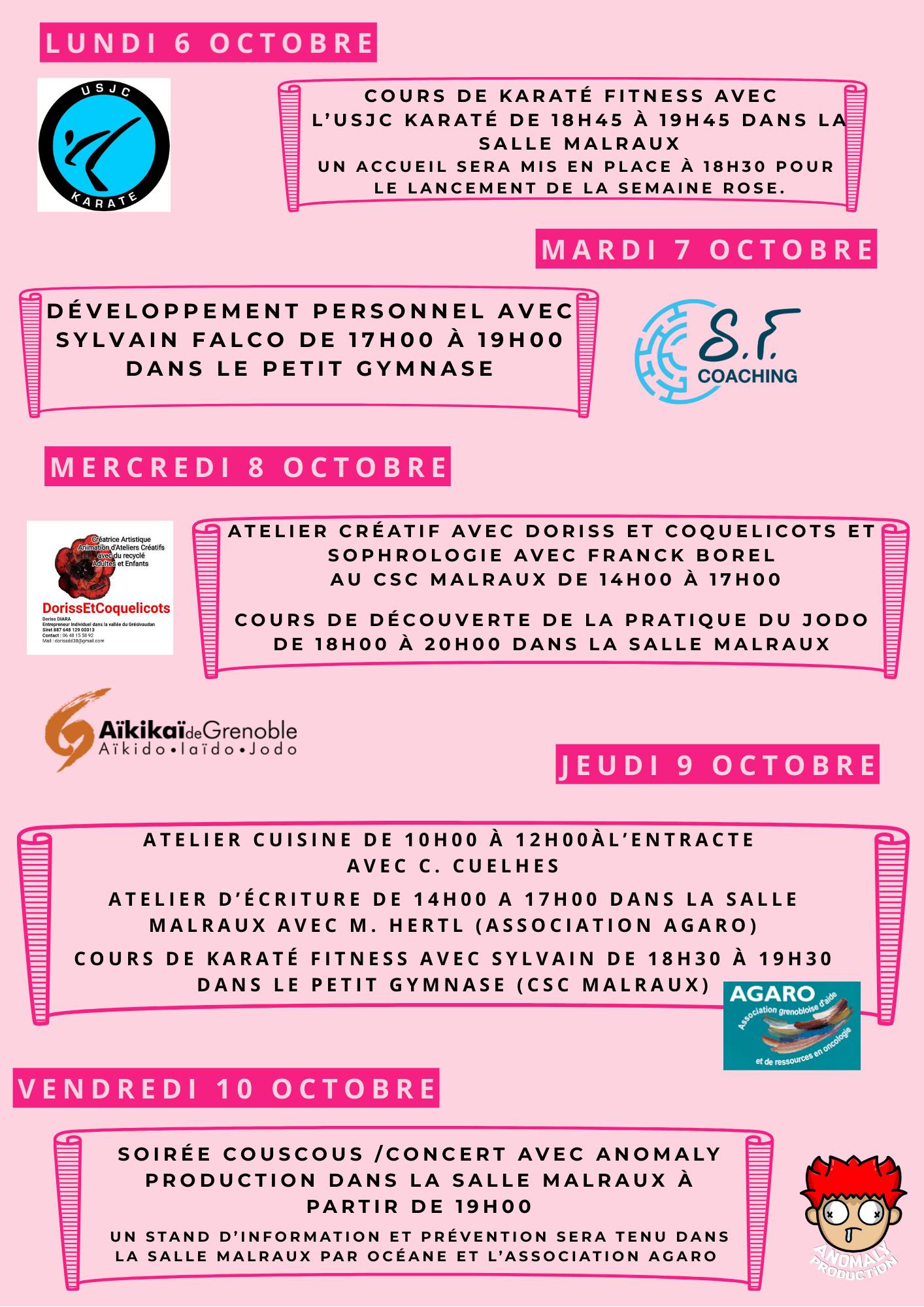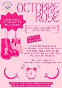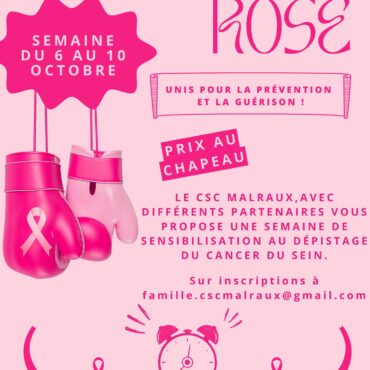 Du 06 au 10 octobre, le CSC Malraux organise, avec plusieurs partenaires, une semaine de sensibilisation ainsi que plusieurs animations : karaté fitness, développement personnel, sophrologie, mais aussi atelier créatif, atelier cuisine, et, pour clôturer la semaine, une soirée couscous / concert.